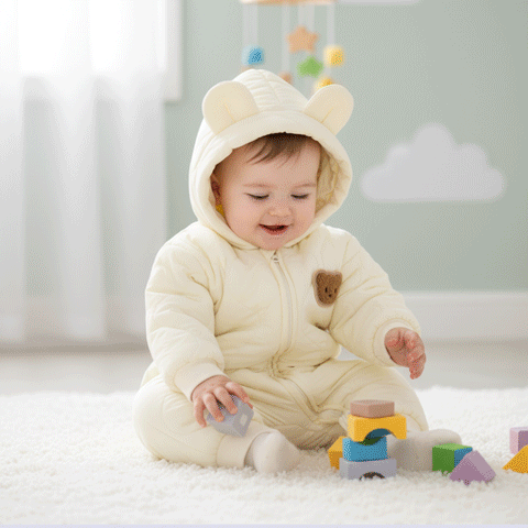 La capuche avec oreilles ne fait pas seulement craquer les parents par son côté adorable - elle protège efficacement la tête et les oreilles sensibles de votre enfant contre les courants d'air. Le col montant et les poignets élastiqués empêchent le froid de s'infiltrer tout en permettant une bonne circulation de l'air. Votre bébé reste au chaud sans jamais transpirer excessivement.
